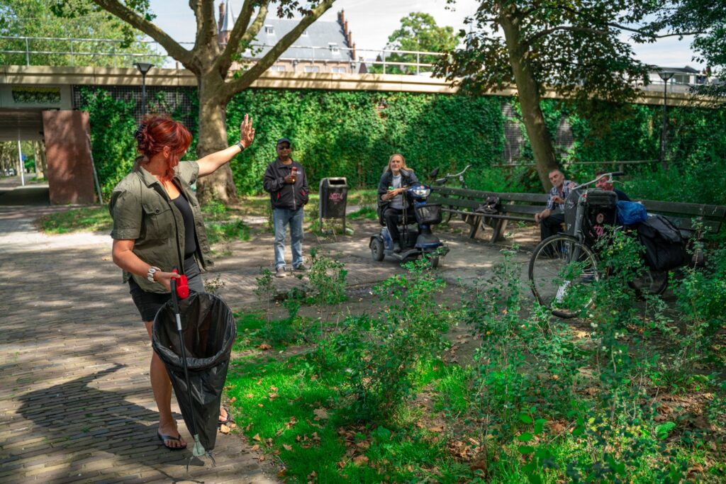 Als we de Kanaalweg oplopen, komen we aan bij een bekend plekje in Delft. ‘De zwerverbankjes’, worden ze genoemd. Ook met de mannen die daar zitten maakt ze een praatje. Ze herkennen haar al. Vragen hoe het met haar gaat. Bij die bankjes hoeft ze overigens nooit afval te prikken, vertelt ze. “Zij zijn heel zuinig op hun plekje.”