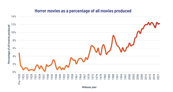 Tegenwoordig is dat echter compleet veranderd. Volgens filmanalist Stephen Follows, die het Horror movie report heeft geschreven, worden er tegenwoordig meer dan 1500 horrorfilms per jaar geproduceerd. Dit betekent dat bijna 13 procent van alle filmproducties binnen het horrorgenre valt. De populariteit van horrorfilms is dus groter dan ooit.