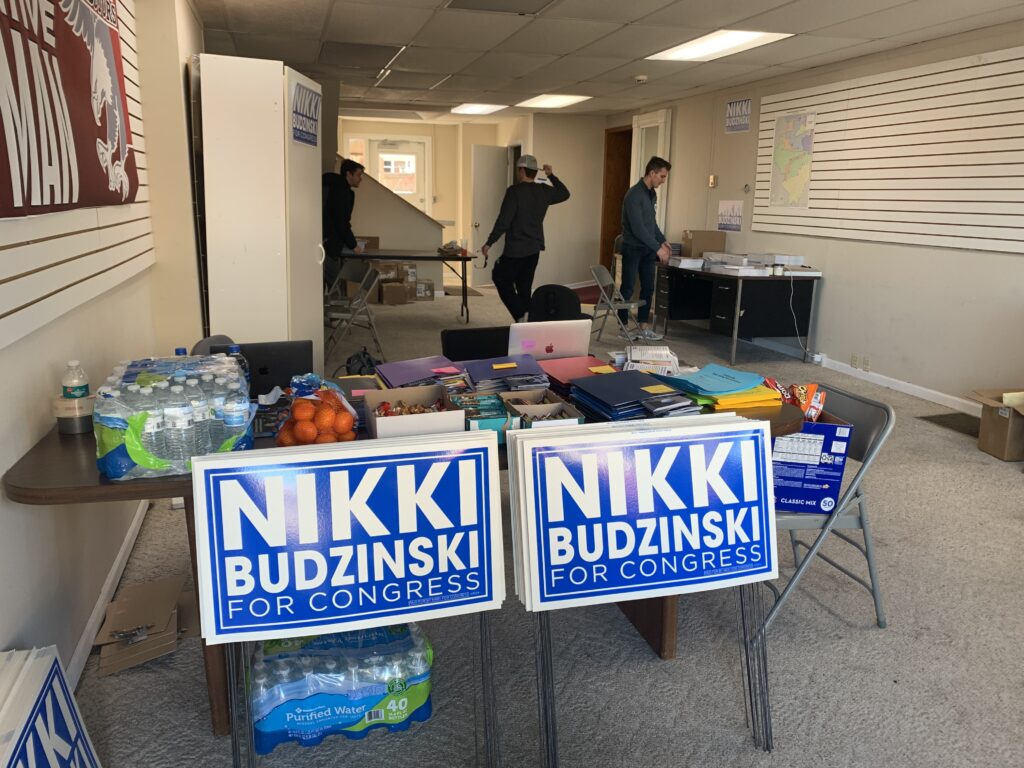 Ze zijn wat aan de late kant. Al rijdend wordt er ingebeld voor de eerste vergadering van de dag. “Nog vijf dagen tot de stembussen sluiten,” horen ze Johnathan (31), één van de managers van de campagne, vertellen. Al sinds april zijn ze hier bezig. Eerst met het werven van vrijwilligers voor de campagne en later ook met langs de deuren gaan om de lokale bevolking bekend te maken met de naam Budzinski en haar platform. In die laatste dagen moet er geoogst gaan worden. Het enige waar het nu nog om draait is ‘get out the vote’.