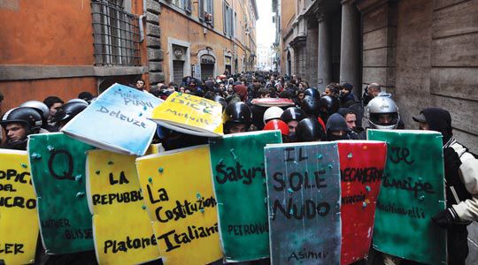 De book blocs zijn geboren in Rome in 2010, waar studenten demonstreerden tegen Berlusconi’s bezuinigingen op het hoger onderwijs en anticipeerden op klappen van de politie. Op de voorkant prijkten boektitels zoals Moby Dick en Don Quichot. De activisten zagen de bezuinigingen als een aanval op kennis, kritiek en cultuur. Met de book blocs lieten zij zien dat zij zich niet zomaar gewonnen gaven.