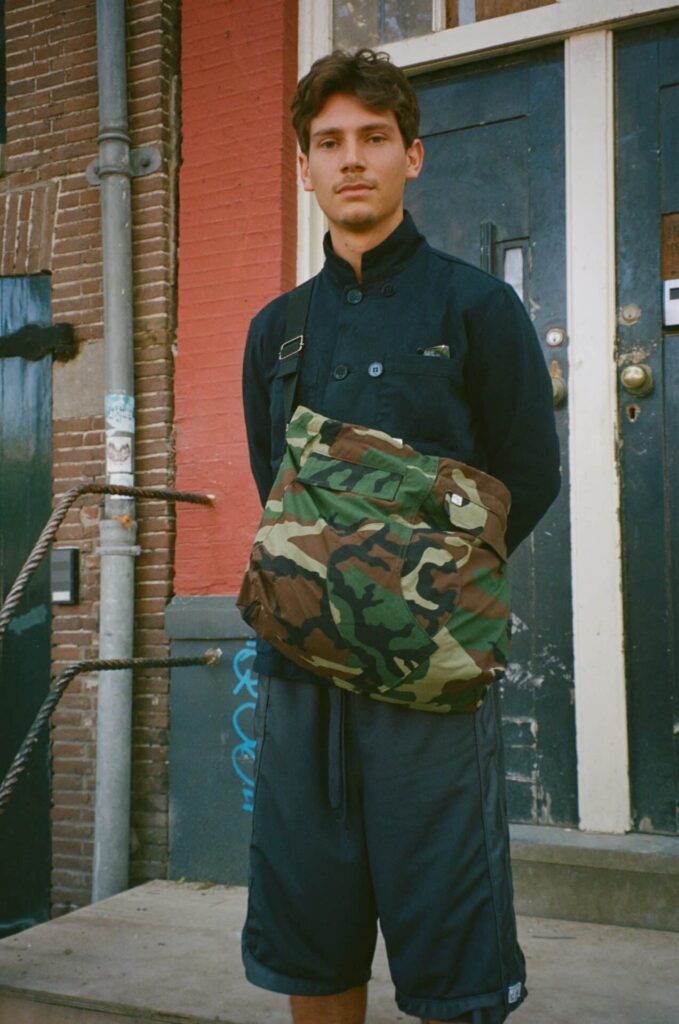 “In het begin hadden we de slogan ‘Need a bag?’, omdat iedereen met een tote bag rondliep of een rugzak. Een tote bag is niet echt smooth en er past niet zoveel in. Een rugzak ziet er niet nice uit, vonden wij. Onze tas is heel simpel, maar er past veel in en je kunt hem overal voor gebruiken. Het is een mix tussen goed gekleed zijn en efficiëntie. Ook is het belangrijk dat oude materialen hergebruikt worden en een nieuw leven krijgen. We noemen ze vergeten stoffen.”
