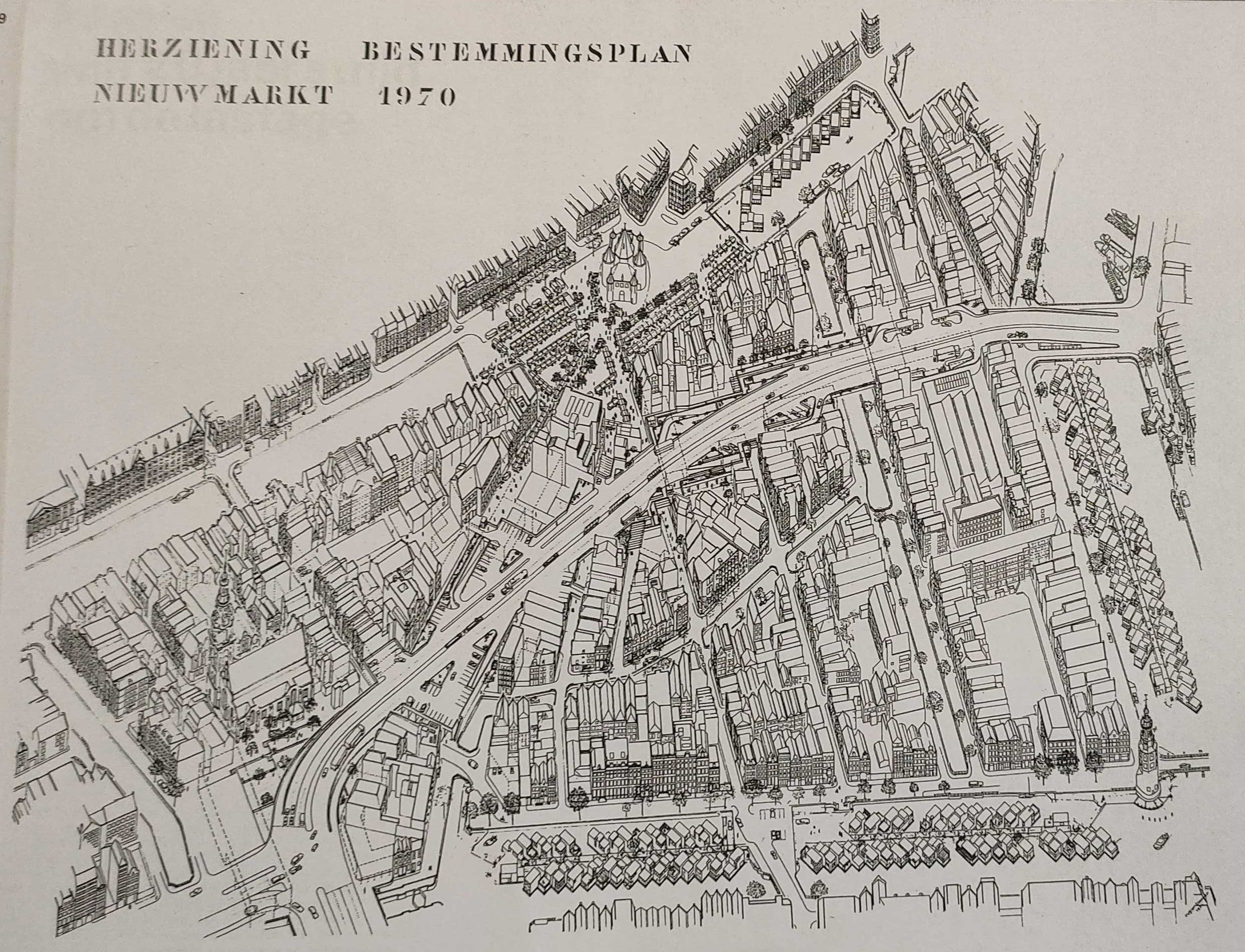 Het is november 1970 als in het Amsterdams Historisch Museum een tentoonstelling te zien is over de vernieuwing in de binnenstad, of nog specifieker: de Nieuwmarktbuurt. Op verschillende tekeningen, maquettes en gemanipuleerde foto’s kunnen Amsterdammers zien hoe architecten door de jaren heen hun ideeën voor de buurt hebben vereeuwigd. Van gedempte grachten tot vierbaanswegen en van kantoorgebouwen tot de metro. Op dat moment is de Oostlijn al in aanbouw en wordt het pad dat de metro onder de Nieuwmarktbuurt moet afleggen, bovengronds steeds zichtbaarder.