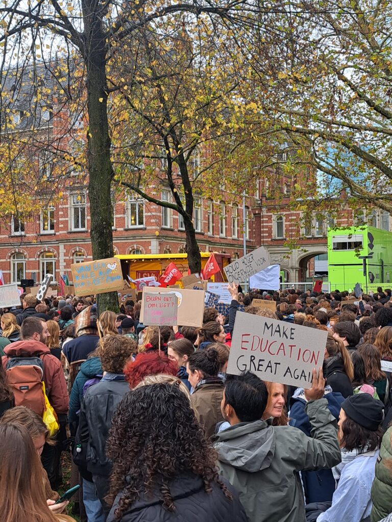 “Vecht, vecht, vecht, onderwijs is een recht,” scanderen studenten en medewerkers in het Moreelsepark te Utrecht, tijdens het protest tegen de aangekondigde bezuinigingen op het hoger onderwijs. Het protest was een dag van tevoren op aandringen van burgemeester Sharon Dijksma afgelast. Toch zijn op 14 november duizenden studenten en medewerkers naar Utrecht gekomen om te demonstreren tegen de aangekondigde bezuinigingen. Een aantal van hen is met een speciale reden naar het protest gekomen: hun opleiding dreigt te verdwijnen.