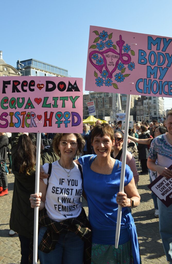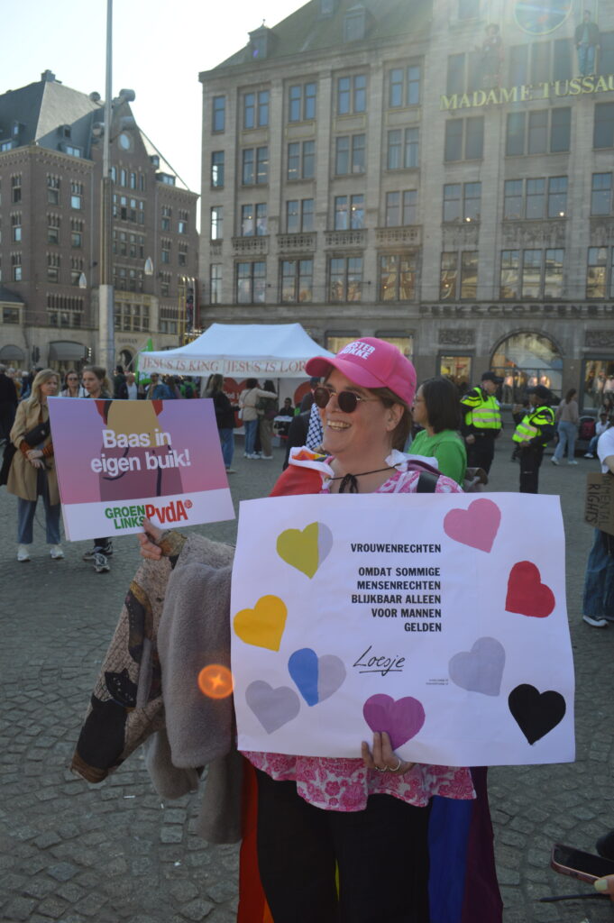 Laura Caris (56, zij/haar) en Sandra Wijffelaars (56, zij/haar) komen uit Weert. Wijffelaars staat op de barricade, omdat ze meemaakte hoe het is om als vrouw niet gehoord te worden. “Ik groeide op als jongste en enige dochter in een familie waar mijn stem niet werd gehoord. Als vrouwen in de familie ‘wijven’ werden genoemd, vroeg ik om respectvoller taalgebruik. Daar werd lacherig over gedaan. Toen ik tegen mijn moeder zei dat ik vandaag ging demonstreren, reageerde ze dat er een kruisje achter mijn naam kwam te staan.” Op de vraag wat dat kruisje betekent, antwoordt Wijffelaars dat ze het niet precies weet, maar dat het niets goeds betekent. Voor Caris is vandaag het moment om op te komen voor de vrijheid van vrouwen: “Ik heb geleefd in een vrijheid die ik normaal vond. Daar zijn vrouwen vroeger voor de barricade opgegaan en wij vonden nu dat wij aan de beurt zijn.”