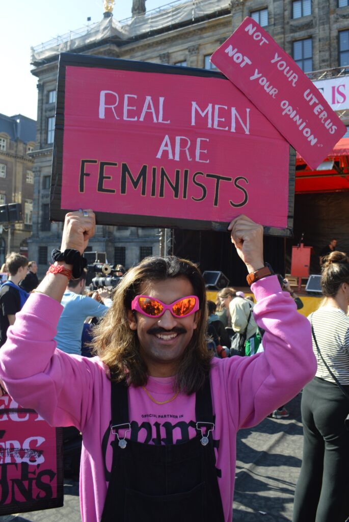 Terwijl het merendeel op de Dam vrouw is, zijn er ook aanzienlijk wat mannen bij de March aanwezig. Harry Singh (31, hij/hem) woont in Amsterdam en protesteert vandaag om zijn vriendinnen en oudere zus te supporten. Hij vertelt dat feminisme belangrijk is voor iedereen ongeacht diens gender. “Het maakt niet uit of je je als man, vrouw of non-binair identificeert, iedereen zou een feminist moeten zijn. Feminisme gaat over gelijkheid. Al zijn we al ver gekomen, onze samenleving is zeker nog niet gelijk. Waarom hebben overheden het recht om te beslissen over wat vrouwen met hun lichaam doen? Ik wil dat vrouwen en non-binaire personen dezelfde rechten hebben die ik als man heb.”