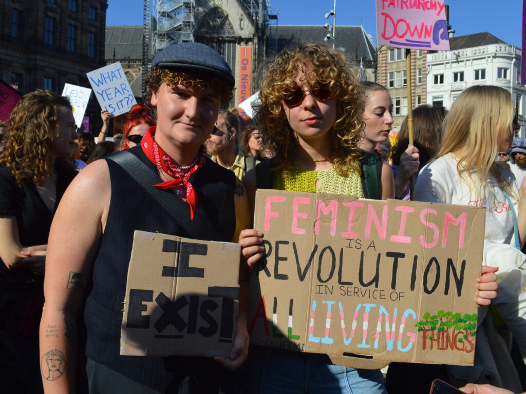 Jip Kuijper (27, die/diens) komt uit Breda en Inge Hansum (24, zij/haar) uit Utrecht. Ze staan vandaag op de barricade om een tegengeluid te bieden aan de huidige politieke ontwikkelingen en op te komen voor iedereen die onderdrukt of gemarginaliseerd wordt. “Protesteren is voor mij dé manier om om te kunnen gaan met wat er in de huidige maatschappij gebeurt,” vertelt Hansum. Kuijper geeft aan dat niet iedereen de noodzaak van feminisme begrijpt: “Mensen denken dat we er al zijn, dat iedereen gelijke rechten heeft, maar die rechten gelden niet voor trans- of intersekse personen.” Op Hansums bord staat ‘Feminism is a revolution in service of all living things’. Deze boodschap is voor haar erg belangrijk: “Ik geloof heilig in wat er op mijn bord staat. Omdat feminisme intersectioneel is, draait het om de strijd tegen alle vormen van ongelijkheid. Het gaat niet alleen om het tegengaan van genderongelijkheid, maar ook om het verzet tegen transfobie, racisme, validisme, de genocide in Palestina en klimaatverandering. Feminisme betekent opkomen voor iedereen die onderdrukt of gemarginaliseerd wordt.”