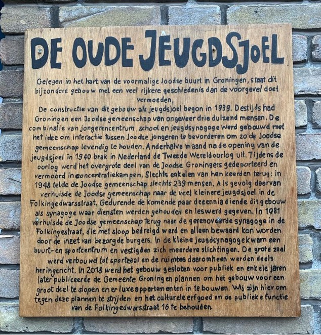 De voormalige sjoel (Jiddisch voor ‘school’) en de grote synagoge in de Folkingestraat zijn de enige overgebleven gebouwen uit de oude Joodse buurt van Groningen. Nadat slechts 239 van de 2800 Groningse Joden de Tweede Wereldoorlog overleefden, werd de grote synagoge omgetoverd tot een chemische wasserette. In de jaren 80 kwam de grote synagoge weer in Joods beheer en kreeg de sjoel een publieke functie als buurt- en sportcentrum.