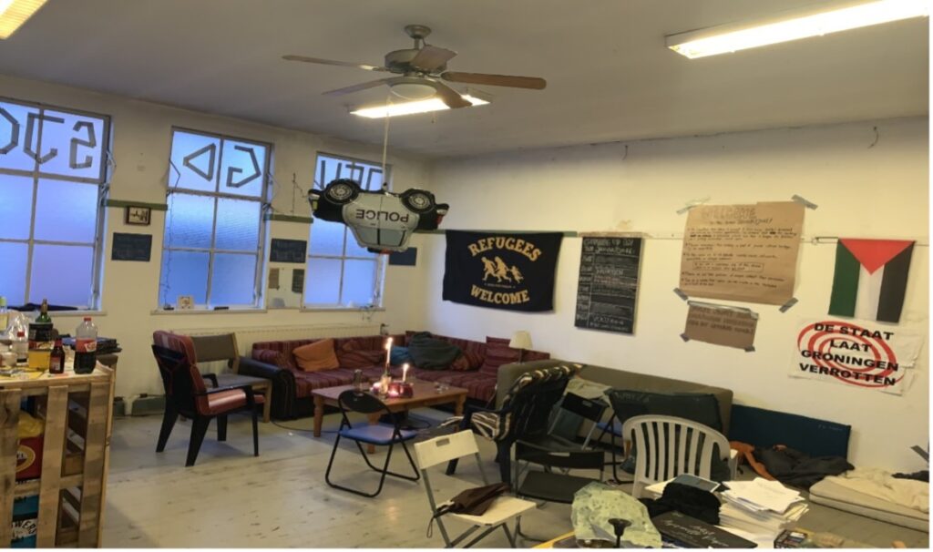Onder een pluizige navy manteljas, groen fleecedekentje, zwarte muts en een regenboogsjaal die diens gezicht gedeeltelijk bedekt, komt een tweetal ogen tevoorschijn. Sporen van gestolde was op wijnflessen verraden dat de kaarsen overuren draaien om nog enige warmte te bieden. “Ik weet niet of de verwarming werkt, maar we doen hem niet aan omdat het vet duur is,” zegt een van de jongeren van het Groningse krakerscollectief Kraaienest.