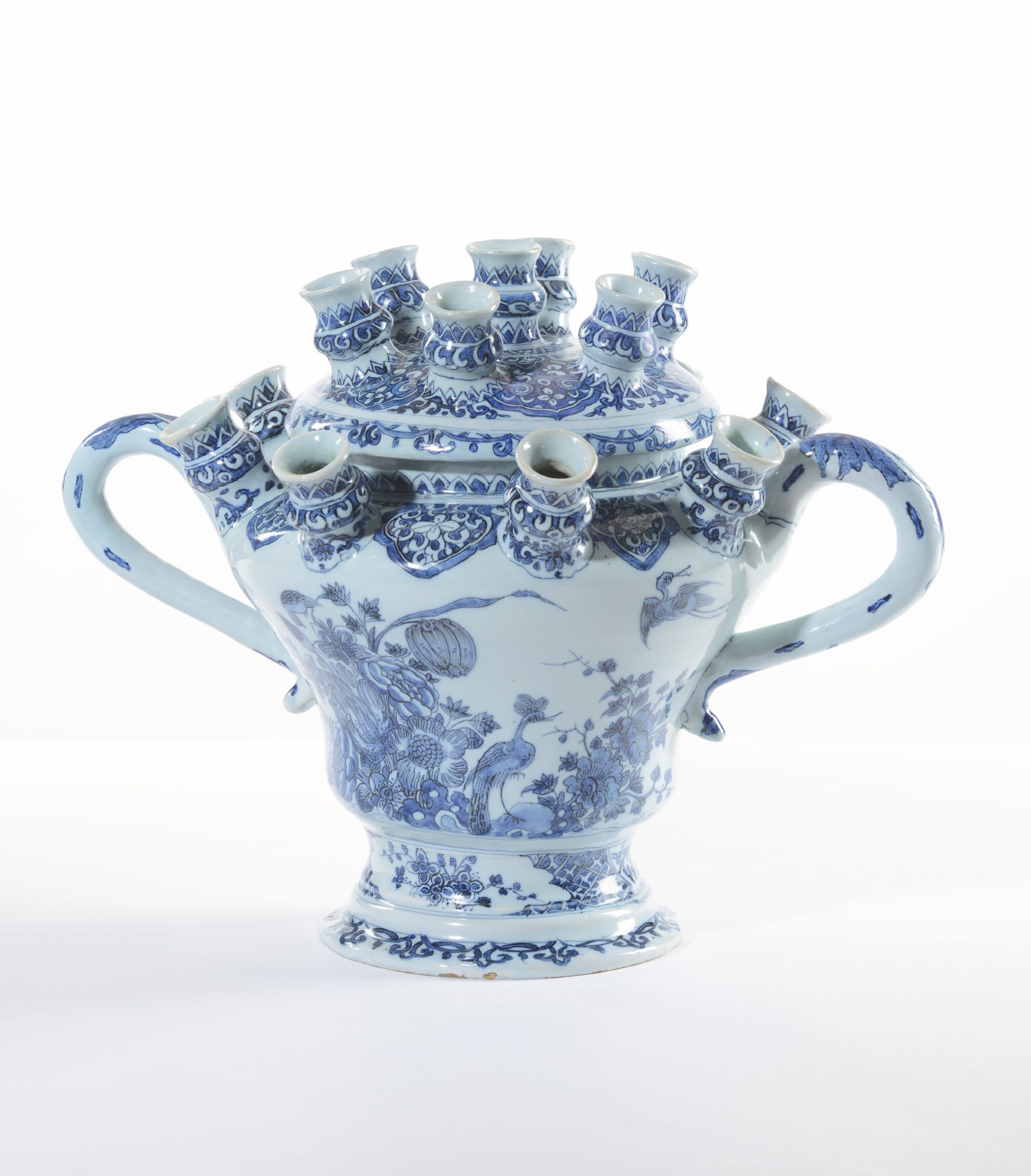 Beeld: Aronson Antiquairs. Blue and White Baluster-Shaped Flower Holder and Cover. Delft, circa 1680. Marked and numbered 2 SVE 18 in blue for Samuel van Eenhoorn, the owner of De Grieksche A (The Greek A) factory from 1678 to 1685.