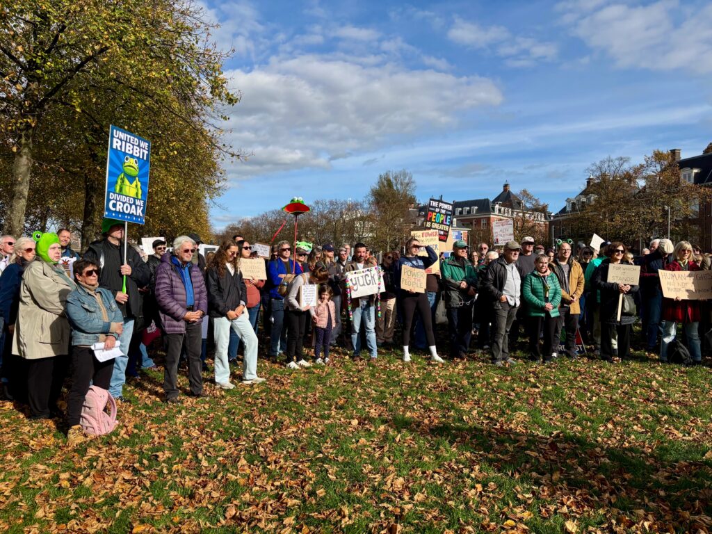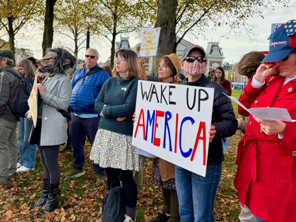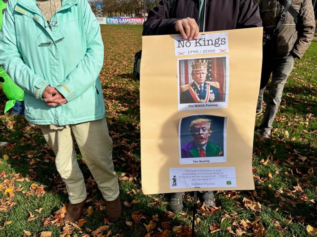 Dat ze vandaag bijeenkomen voor een vreedzaam protest, is niet vanzelfsprekend, legt Hughes uit. “Sommige van onze vrienden en familie in de VS nemen elke dag risico’s door op te komen voor de democratie en de rechtsstaat. Het kostte ons alleen een vergunning van de stad, een kort telefoontje met de politie en wat geluidsapparatuur. Degenen die zich veilig kunnen uitspreken, moeten dat blijven doen en hun stem laten horen. In Amerika zijn er geen tirannen, geen dictators en geen koningen!”
