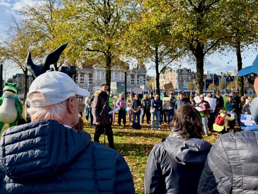 Kikkers, kippen en kinderen: tweehonderd mensen komen zaterdagmiddag kort voor 13:00 uur bijeen voor het Amerikaanse consulaat aan het Museumplein in Amsterdam. Hoewel er wordt gelachen, is de toon van de demonstratie serieus. Met protestliederen en leuzen uiten de aanwezigen hun zorgen over de toekomst van de democratie in de Verenigde Staten en het leiderschap van president Donald Trump.