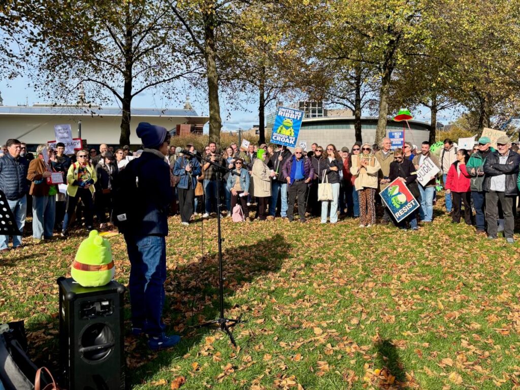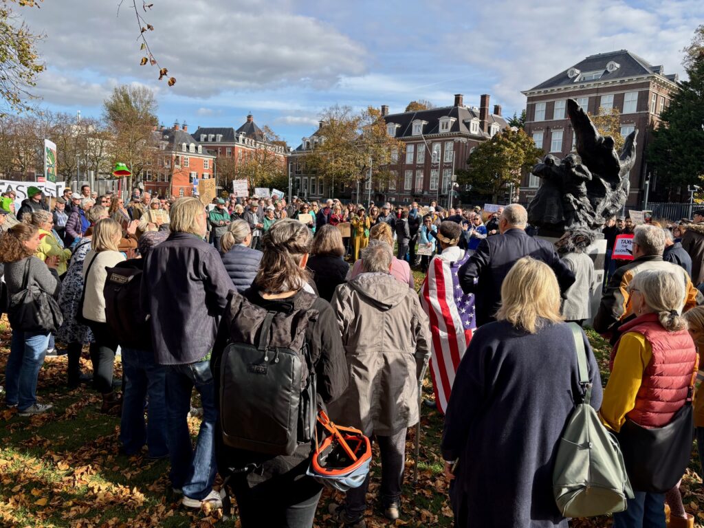 Oostwal woont al zeventien jaar in Nederland met haar Nederlandse echtgenoot Ruben. “Het is fantastisch om te zien dat er zoveel mensen zijn gekomen – zelfs mijn home-representative Jay Inslee. Dat geeft me hoop dat Amerika nog niet uit elkaar valt. We tonen hier steun voor de VS, maar ook voor Nederland zelf: tegen facisme, dat overal in Europa groeit.” Ze doet haar kikkerhoed af en stopt deze in haar tas. “Vandaag heeft mij opgebeurd,” zegt ze. “Maar nu ga ik naar huis, want mijn rug doet pijn.”