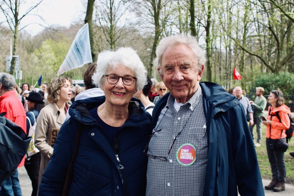 “Wij gaan al langer naar demonstraties dan dat menig demonstrant hier oud is,” grapt Hans Opschoor (79) die samen met zijn vrouw Irene Opschoor (78) rondloopt op de A12-blokkade. Hans was hoogleraar milieueconomie aan de Vrije Universiteit Amsterdam en lid van het Intergouvernementele Panel voor Klimaatverandering, ook wel bekend als de IPCC. Terwijl hij van negen tot vijf onderzoek deed naar de oorzaken en gevolgen van klimaatverandering als hoogleraar, was hij ’s avonds en in het weekend te vinden op demonstraties met Irene. Vroeger lag de focus van klimaatdemonstraties op het verbod van kernenergie, nu op het stopzetten van fossiele brandstoffen, merkt Irene op. Hans en Irene zijn al enkele jaren met pensioen, maar betekent dit niet dat zij niet langer deelnemen aan demonstraties. In tegendeel, het stel, dat inmiddels 58 jaar getrouwd is, is nooit gestopt met demonstreren. Lawaai maken is het enige wat werkt, merkt Hans op. En lawaai maken is nog steeds nodig, vindt Irene. “Het oplossen van de klimaatcrisis is uiterst complex. Dat doe je niet alleen met het stopzetten van de afvoer van fossiele brandstoffen, maar het is wel een goed begin,” zegt Hans. Met het bijwonen van de demonstraties willen de grootouders van vijf kleinkinderen bij politici aandacht vragen voor de klimaatcrisis. De plannen voor het stopzetten van fossiele brandstoffen liggen er, maar politici pakken niet door, merkt Hans op. “Daarom staan wij hier.” Of ze ooit stoppen met demonstreren? Nee, schudt Irene. “Zolang we leven, gaan we door.”