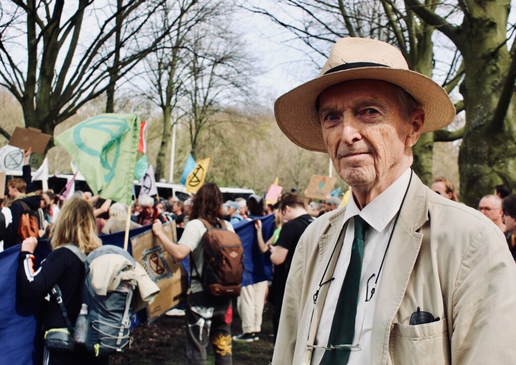 Henk van Wijk (80) kijkt rustig om zich heen terwijl er verschillende groepen met activisten langs hem marcheren. Hij bezoekt de blokkade vandaag met zijn dochter, die ergens anders rondzwerft op het terrein. Normaal gesproken zijn de demonstraties voor Henk echt een familie-uitje. “Ik ga vaak met mijn kleindochter naar de demonstraties van Extinction Rebellion. Zij is ook klimaatactivist, net als ik,” zegt hij trots. “Met de hele familie gaan we op pad.” Naast dat Henk en zijn familie de demonstraties bezoeken om aandacht te vragen voor de gevolgen van de klimaatverandering, ervaart hij de XR-demo’s ook als een groot feest. “Het is er altijd gezellig.”