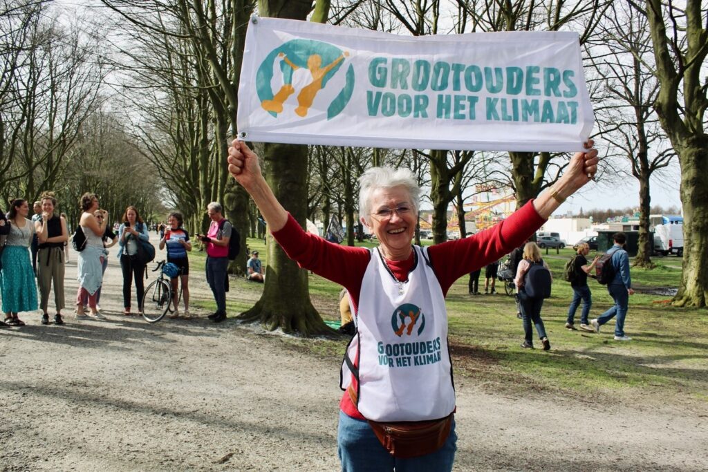 Haar leeftijd van ruim 75 jaar weerhoudt Margrett er niet van om op een zonnige zaterdagmiddag even langs te gaan bij de XR-demo. Met een wit hesje en een spandoek waarop in het groen vetgedrukt ‘Grootouders voor het Klimaat’ staat, valt ze op tussen de mededemonstranten. Margrett is lid van de klimaatbeweging Grootouders voor het Klimaat, een stichting die bestaat uit grootouders, groottantes, grootooms, oudooms en oudtantes. “Maar iedereen mag lid worden, hoor. Het is geen vereiste dat je opa of oma bent. Als je maar een hart hebt voor de derde en volgende generaties, ben je welkom. Het gaat om de symboliek,” vertelt de Haagse oma van vier kleinkinderen. Toch zijn de mede-activisten van haar klimaatbeweging die ook rondlopen op de demonstratie vaak wel zestigplus, ondanks dat dit geen vereiste is. Iedere twee weken komt de beweging samen voor een pleindemonstratie voor de Tweede Kamer. Hoe komt het dat de leden van deze klimaatbeweging op deze leeftijd nog zo gemotiveerd zijn om zich in te zetten voor het klimaat? “Ik sta hier echt voor de volgende generatie, voor mijn kleinkinderen,” vertelt Margrett. “Ik wil hen laten zien dat een democratie tot haar recht komt tijdens een demonstratie en dat we wel degelijk dingen kunnen veranderen, óók voor het klimaat. We mogen niet opgeven.”