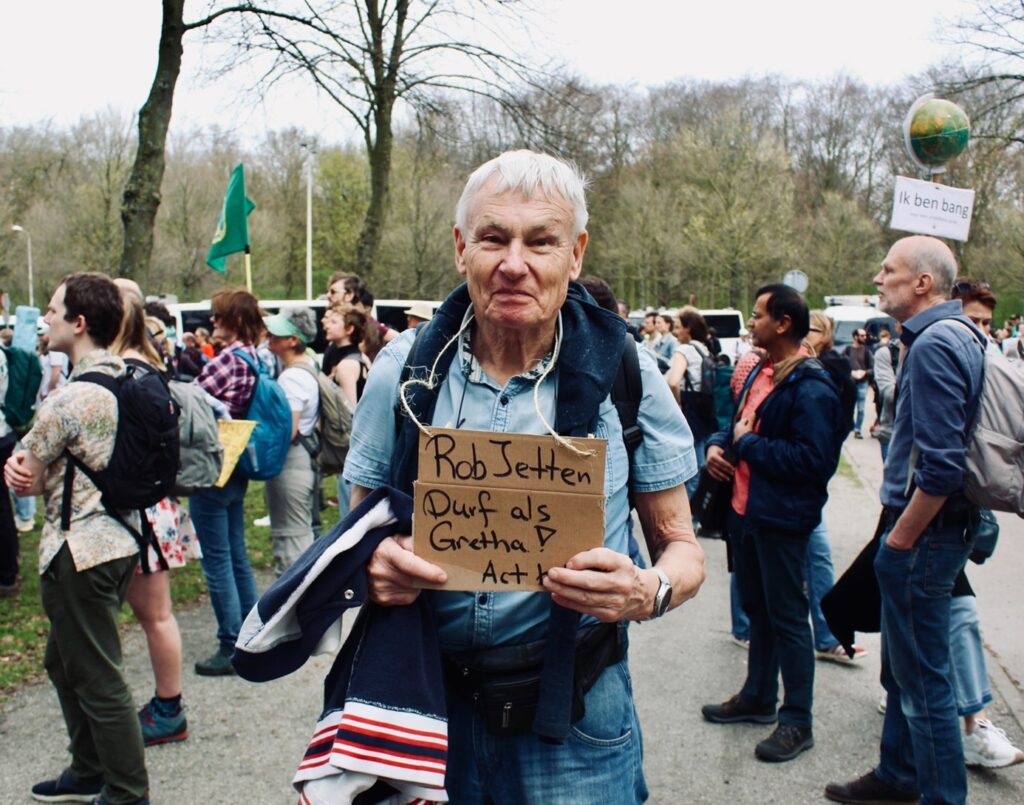 “Naast Greta Thunberg was mijn kleindochter mijn inspiratiebron om klimaatactivist te worden. Door haar sta ik hier,” vertelt Bob Hoekstra die met de trein vanuit Waalwijk naar Den Haag is gereisd voor de A12-blokkade. Dit keer bezoekt hij de klimaatdemonstratie alleen met zijn dochter, maar soms gaan er ook drie generaties – Bob, zijn dochter en kleindochter – samen op pad. Bob heeft enkele jaren in India gewoond voor zijn werk. Als zo’n land uiteindelijk gevaar loopt door de gevolgen van de klimaatcrisis, dan zijn daar heel veel mensen de dupe van, merkt hij op. “Ik sta hier voor hen, voor de gehele wereldbevolking die ooit slachtoffer zou kunnen worden van de klimaatcrisis,” vertelt hij. “Zolang het mogelijk is, moeten we de gevolgen van de klimaatcrisis zoveel mogelijk beperken.” Bob vindt dat opa’s en oma’s verantwoordelijk zijn om de aarde goed door te geven aan de jongere generaties. Daarom bezoekt hij sinds een jaar verschillende klimaatdemonstraties door het land om een boodschap af te geven bij beleidsmakers. Terwijl hij naar zijn kartonnen protestbordje wijst, legt Bob uit wat hij daar met viltstift heeft neergezet: ‘Rob Jetten, durf als Gretha, act now.’