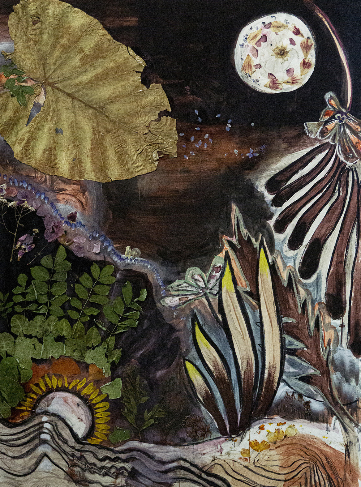 Schilderij: Moon, diverse botanische inkten en gedroogde bloemen op papier, 120 x 160 cm, 2020