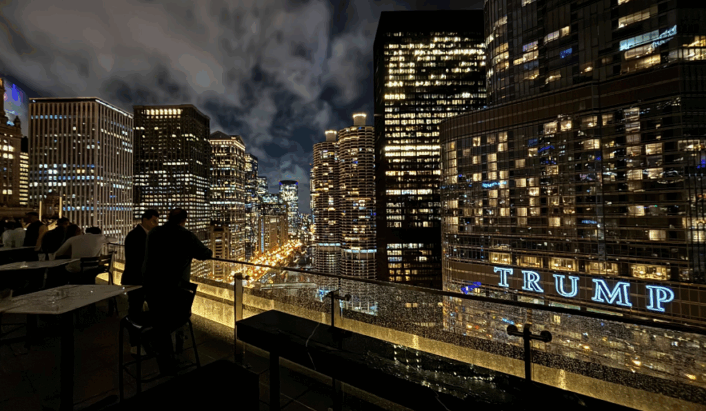 Mensen proberen te genieten met een cocktail op een rooftopbar tegenover de Trump Tower in Chicago, maar het klamme weer in combinatie met de uitslagen werkt verstikkend voor de Democratische kiezers. Uit het geroezemoes valt duidelijk paniek op te maken. Aan de telefoon zegt een man aan de bar tegen de persoon aan de andere kant van de lijn dat hij rustig moet blijven, dat er nog veel stemmen geteld moeten worden. “Het is nog niet beslist,” zegt hij om de ander gerust te stellen.