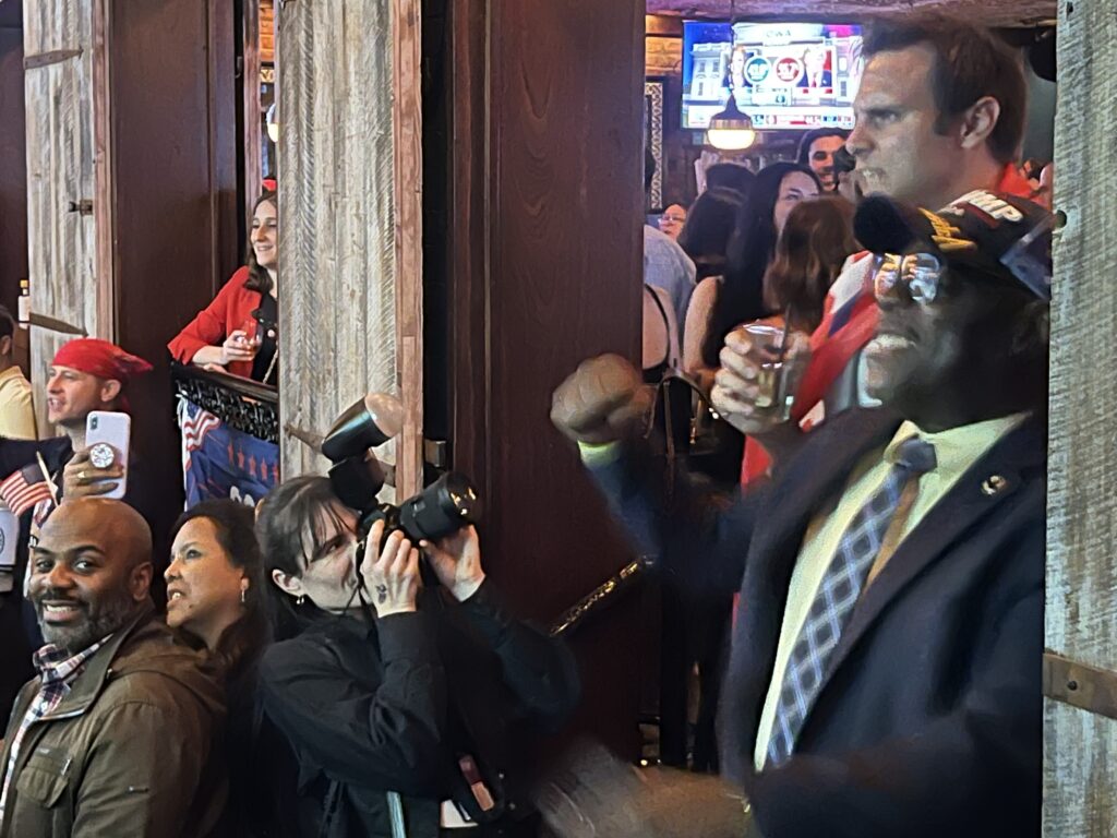 Het zelfvertrouwen van de jonge Republikeinen is besmettelijk bij het NYYRC-feest. Een van de vele MAGA-petdragers schreeuwt: “Ze probeerde hem te vermoorden, maar raad eens: hij is er verdomme nog steeds! U.S.A. U.S.A. U.S.A.!” De geur van frituur heerst nog steeds, de vloeren worden plakkeriger van het bier, Fox News staat op maximum volume en de rode dassen komen wat losser. Stuiterend van blijdschap roept Aidan Griffin (23), werkzaam in de financiële sector: “Kijk om je heen, het is bomvol in deze kroeg, en mijn voorspellingen zijn ook goed: Trump gaat winnen!” Hij maakte zich zorgen dat de Democraten de uitslag niet zouden erkennen, maar met een grote glimlach zegt hij: “De resultaten zijn te groot om te manipuleren.” De uitslag is nog niet officieel, maar dat lijkt de leden van de NYYRC niet te deren.
