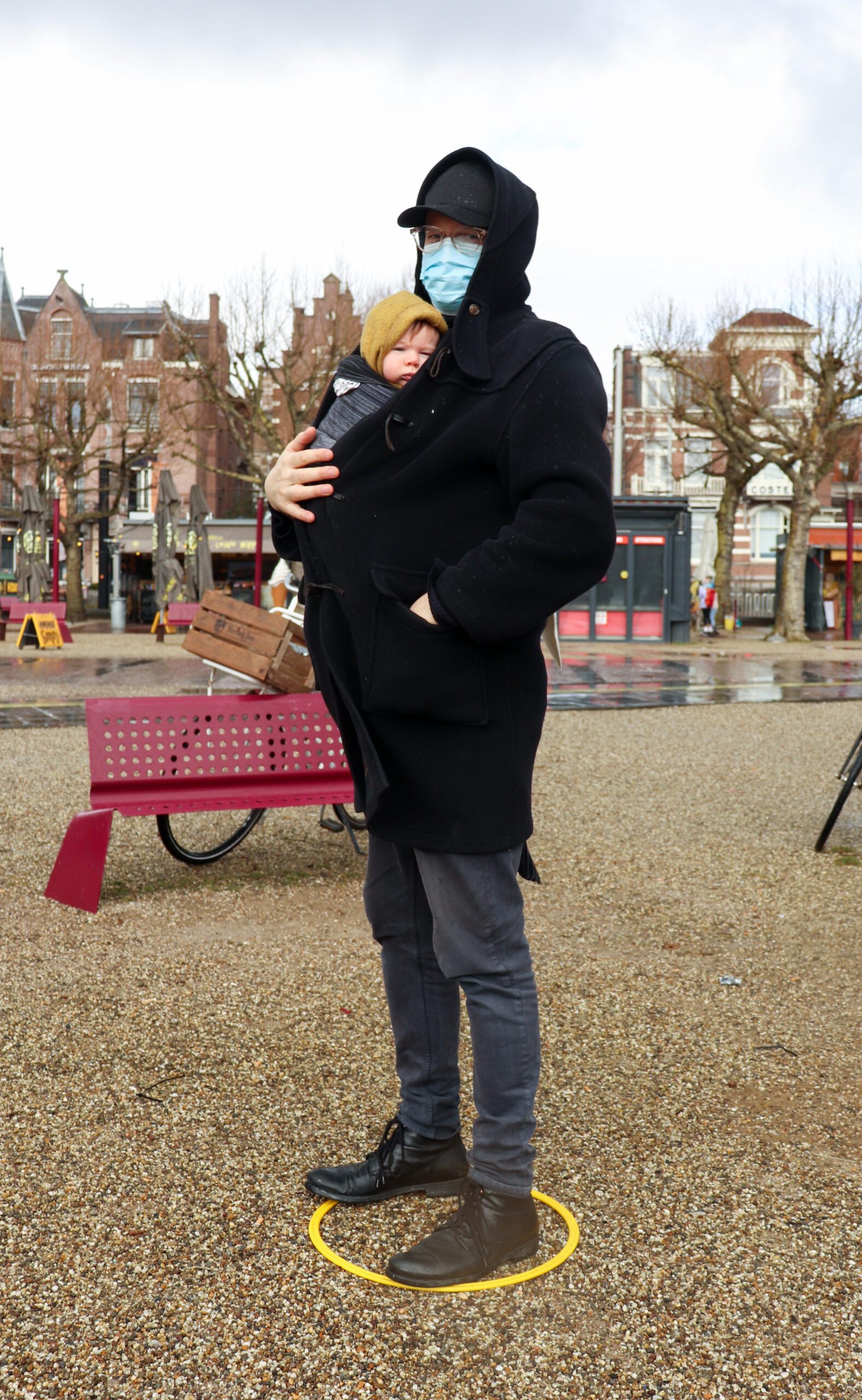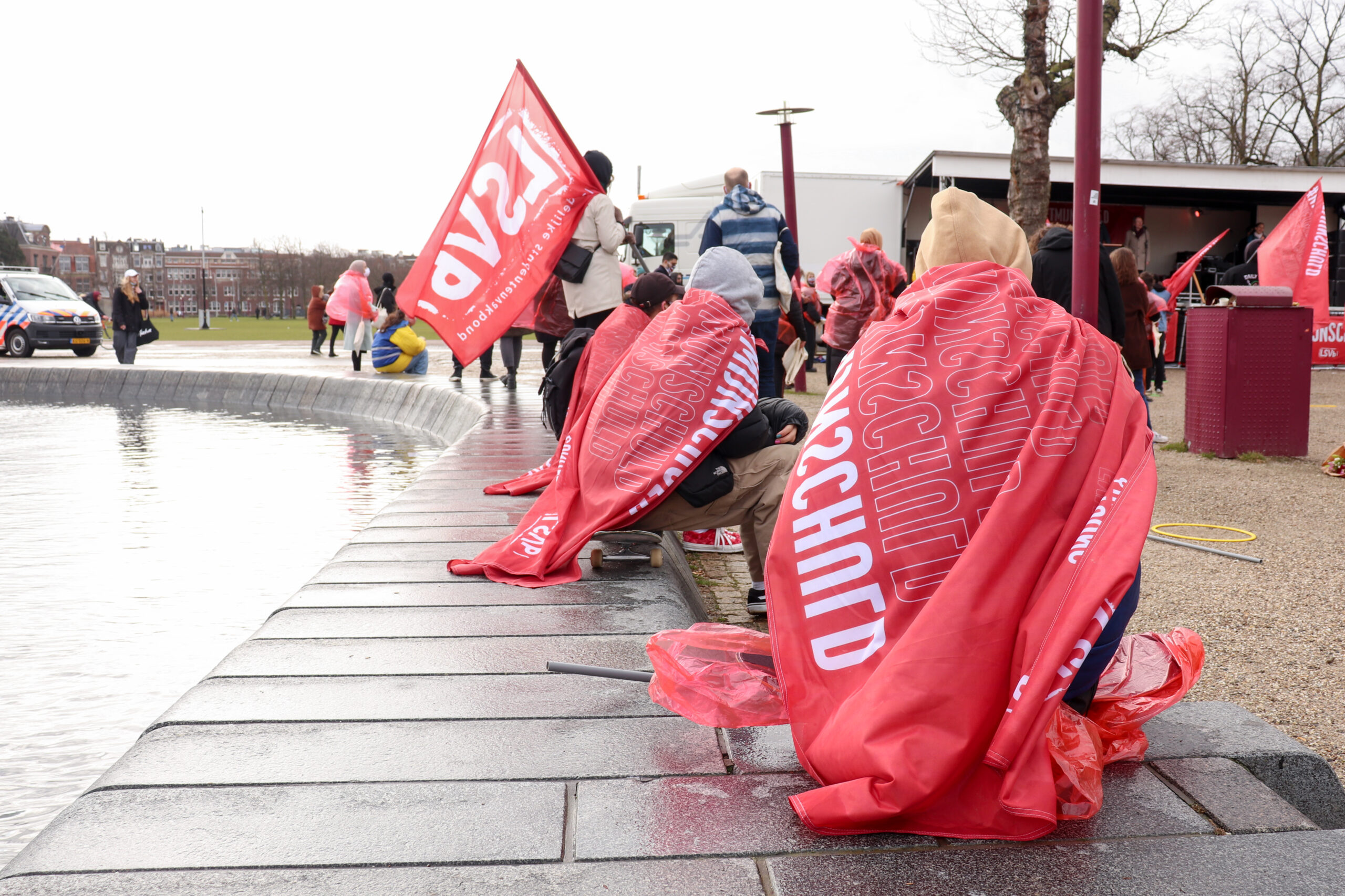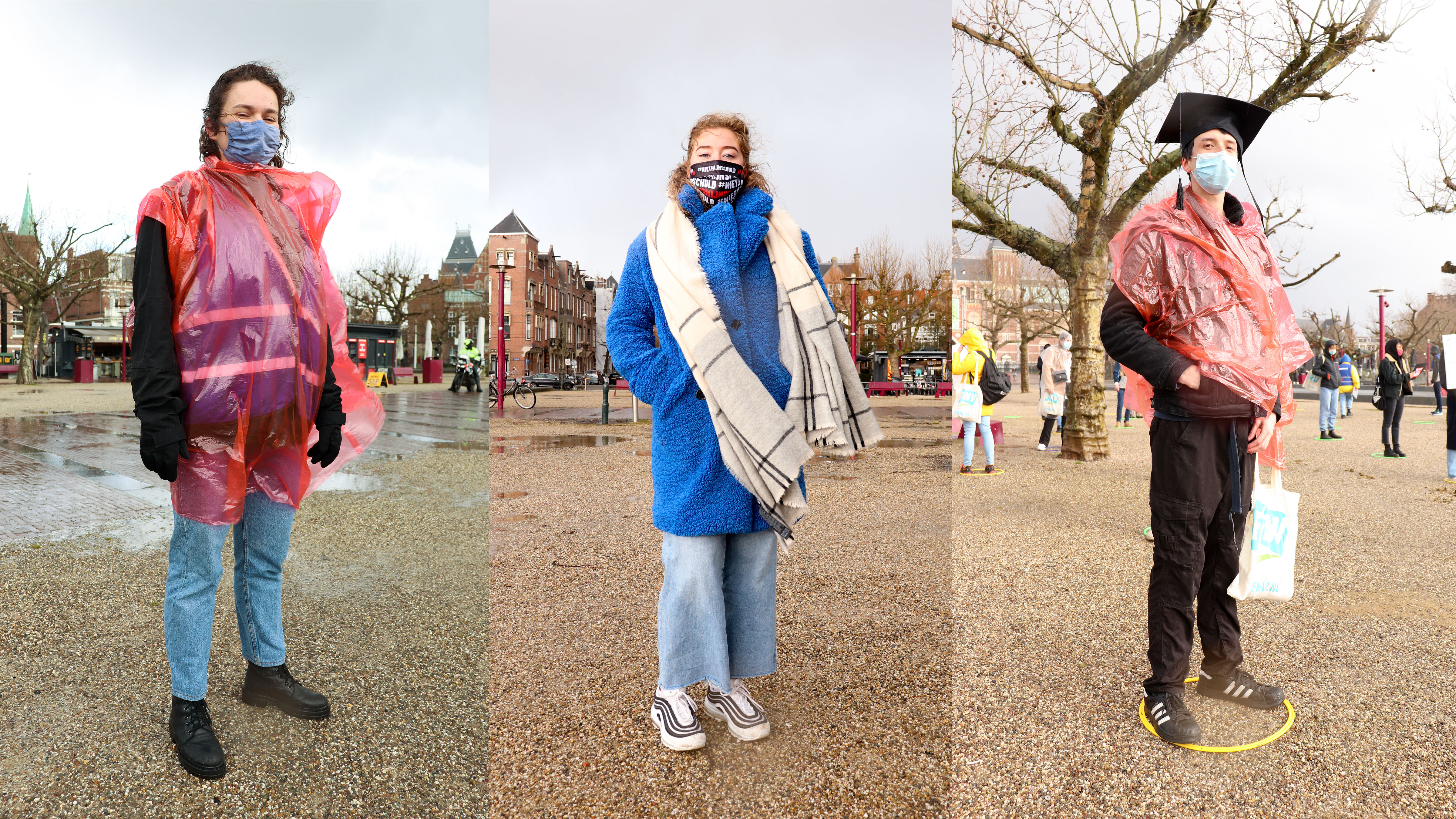 Verspreid in hoepels, om de anderhalve meter afstand te waarborgen, staan de demonstranten op zaterdag 13 maart in de regen. Sommigen houden vlaggen in de lucht en dragen mondkapjes van #NietMijnSchuld: een actie georganiseerd door vakbond FNV Young & United en de Landelijke Studentenvakbond (LSVb).
