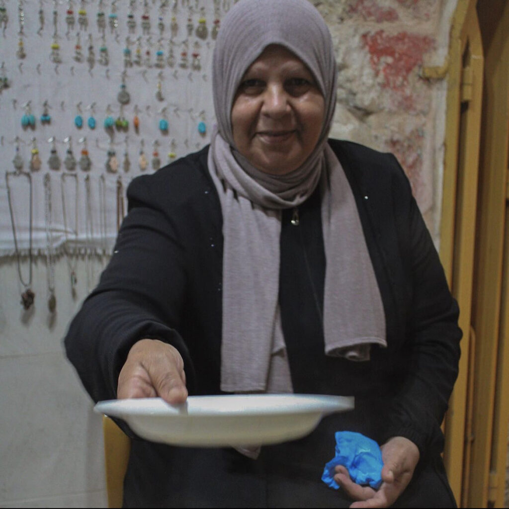 “Layla’s winkel is in de Oude Stad, daar zitten veel Israëlische soldaten. Op de dag dat de oorlog uitbrak, appte ik haar of alles oké was. Ze zei: “Ik wil mijn winkel niet uit, de soldaten schieten iedereen neer die bij ze langskomt.” Op dat moment pakte ik de sjaal die ik van haar heb, en sloeg ik hem stevig om me heen, als een soort knuffel. Voor mij was het een soort symbool dat ik Layla nog bij me had.”