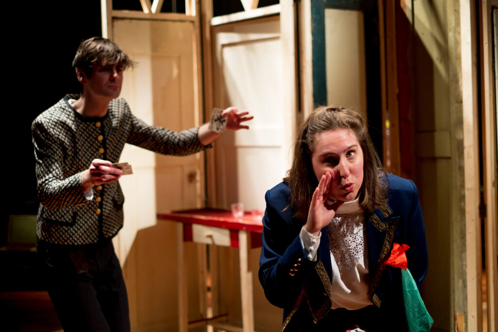 Het verhaal van Valentijn en zijn hitsige medemensen kenmerkt zich vooral door een afgemeten rommeligheid; naast de dubbelrollen wisselen de acteurs tijdens een scène meerdere keren van personage. De spelers geven elkaar aanwijzingen tijdens het spelen – stappen één zinnetje uit hun rol om iets te verhelderen. Ondertussen ben je als kijker bang dat het gammele decor een keer de geest geeft.