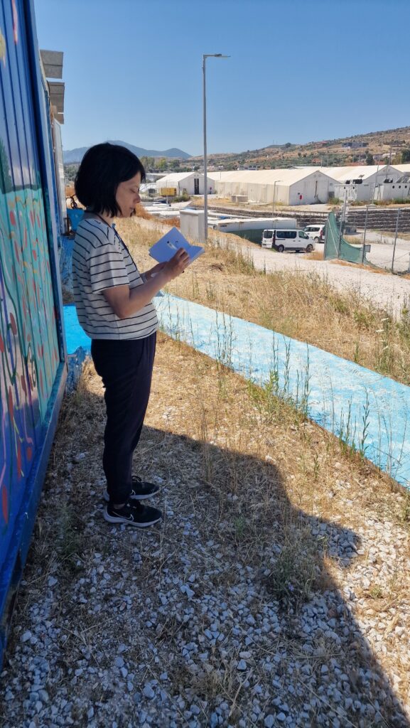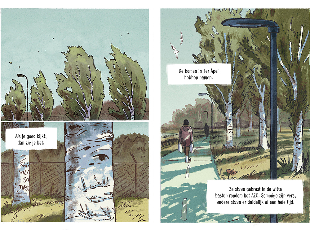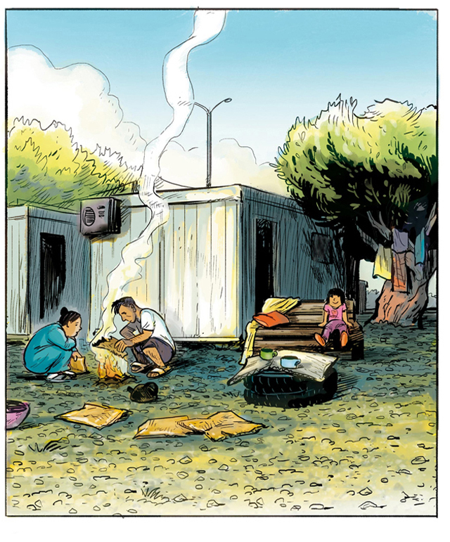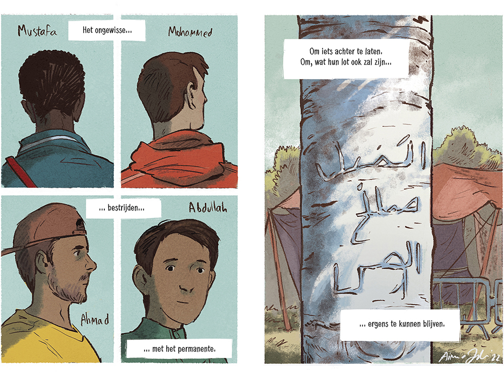 Door haar interesse in migratieverhalen belandde Aimée, via een vriendin die vrijwilligerswerk deed, in 2017 op Lesbos. Foto’s maken in het vluchtelingenkamp mag niet, maar tekenen wel. “Ik had het gevoel dat strips echt wat zouden kunnen betekenen, juist omdat camera’s verboden waren in het kamp. Dan weet je dat er iets fout zit, dan is er duidelijk iets waarvan ze niet willen dat het naar buiten komt.”