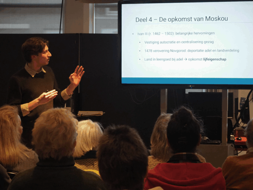 Het is een van de eerste zonnige vrijdagmiddagen van het jaar. Toch verzamelt een groep van bijna dertig senioren zich in een zaaltje achterin bibliotheek Loosduinen in Den Haag. Er staat een college van Stichting Oud Geleerd Jong Gedaan op het programma. Studentdocent Wouter van der Hoff (21) geeft vandaag het eerste college in een reeks over Russische geschiedenis.