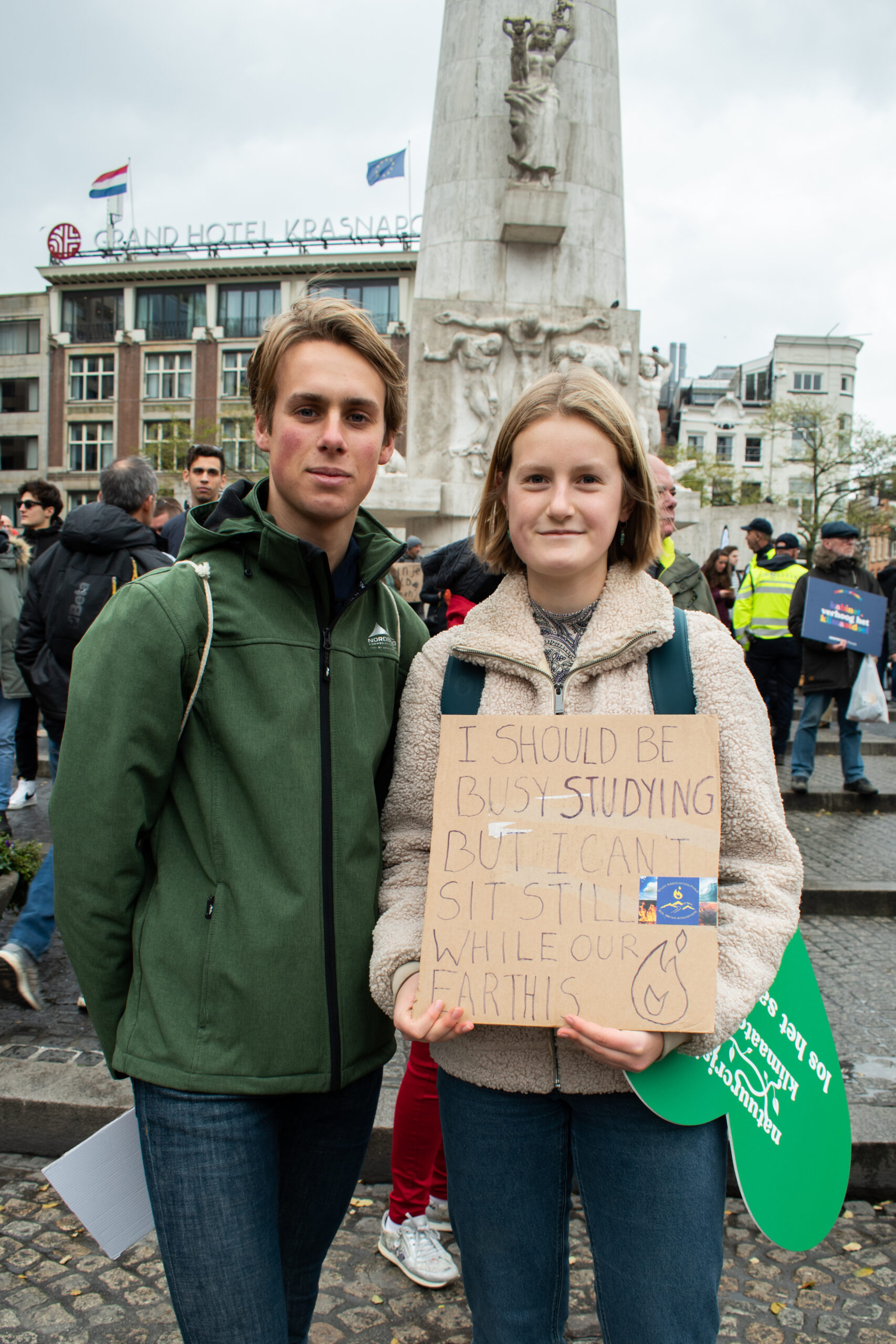 “Eigenlijk zouden we nu moeten leren voor tentamens van volgende week. Toch kiezen we ervoor om hier te zijn, omdat we vinden dat opkomen voor het klimaat belangrijker is dan een goed cijfer. Wij vinden het maar loze beloftes vanuit de klimaattop. Er moeten veel grotere stappen gemaakt worden door de overheid om bijvoorbeeld goed gedrag bij de consument te stimuleren. Zoals het nu gaat, gaan we de klimaatdoelen nooit halen.”